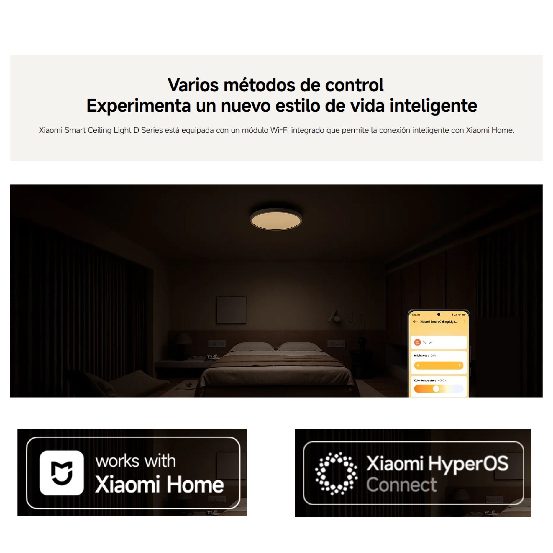 Cuenta con conectividad Wi-Fi integrada para control desde la app Xiaomi Home, permitiendo ajustar brillo, temperatura de color y horarios desde el smartphone. Además, es compatible con asistentes de voz como Google Assistant y Alexa, facilitando la automatización del hogar y el control manos libres.