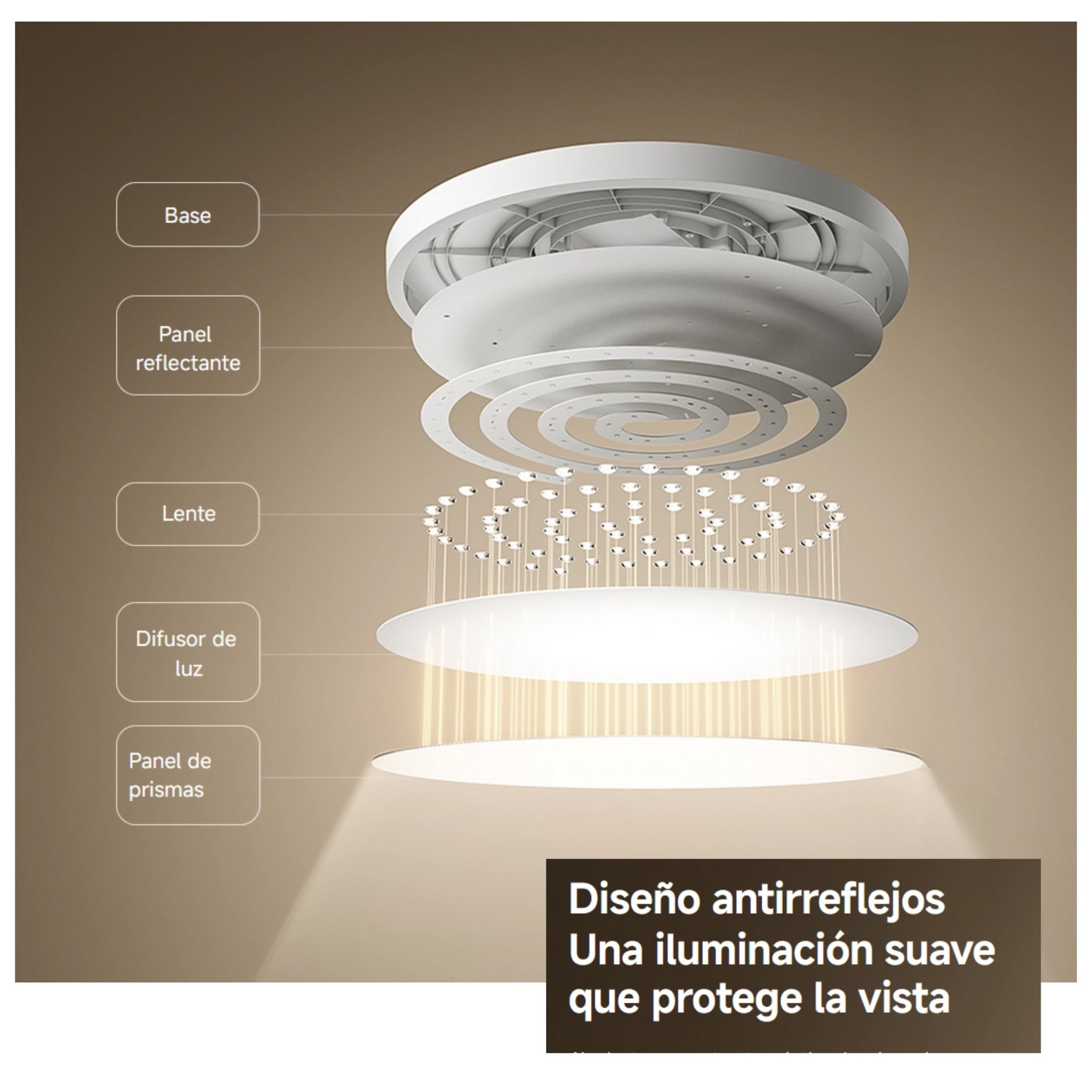 Gracias a su estructura óptica antideslumbrante (UGR<19), reduce reflejos y fatiga visual durante usos prolongados. Su diseño ultradelgado de solo 6 cm aporta una estética minimalista que se integra fácilmente en distintos estilos de decoración, manteniendo una iluminación suave y agradable para los ojos.